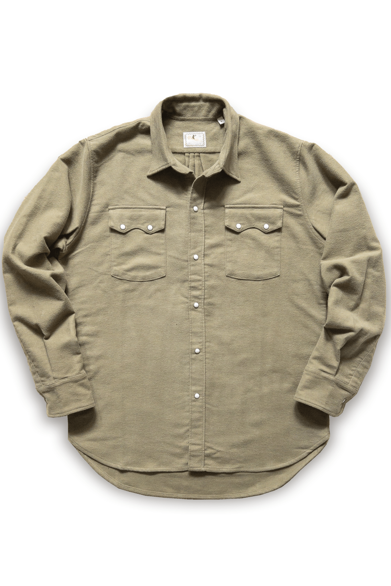 Wythe's moleskin pearsnap shirts are legendary. Super soft washed and brushed 100% cotton moleskin is super comfortable and just gets better with age, and custom pearl snap buttons, sawtooth pockets and a curved back yoke nod to western styling. Traditional tailored fit, true to size. Size up for a looser/overshirt option.