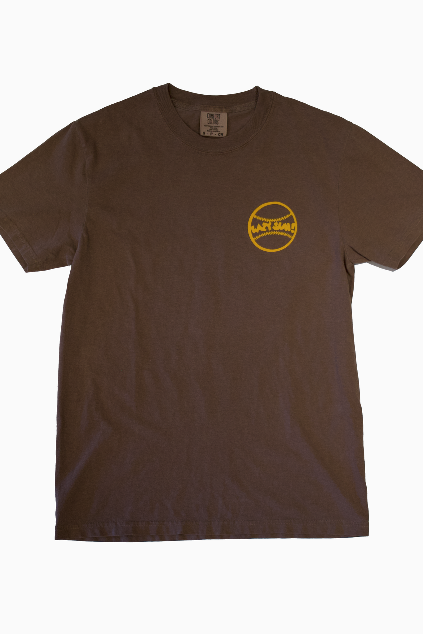 Garment dyed heavyweight 100% cotton short sleeve tee. Small print on front chest, large print on back. Regular fit, preshrunk.